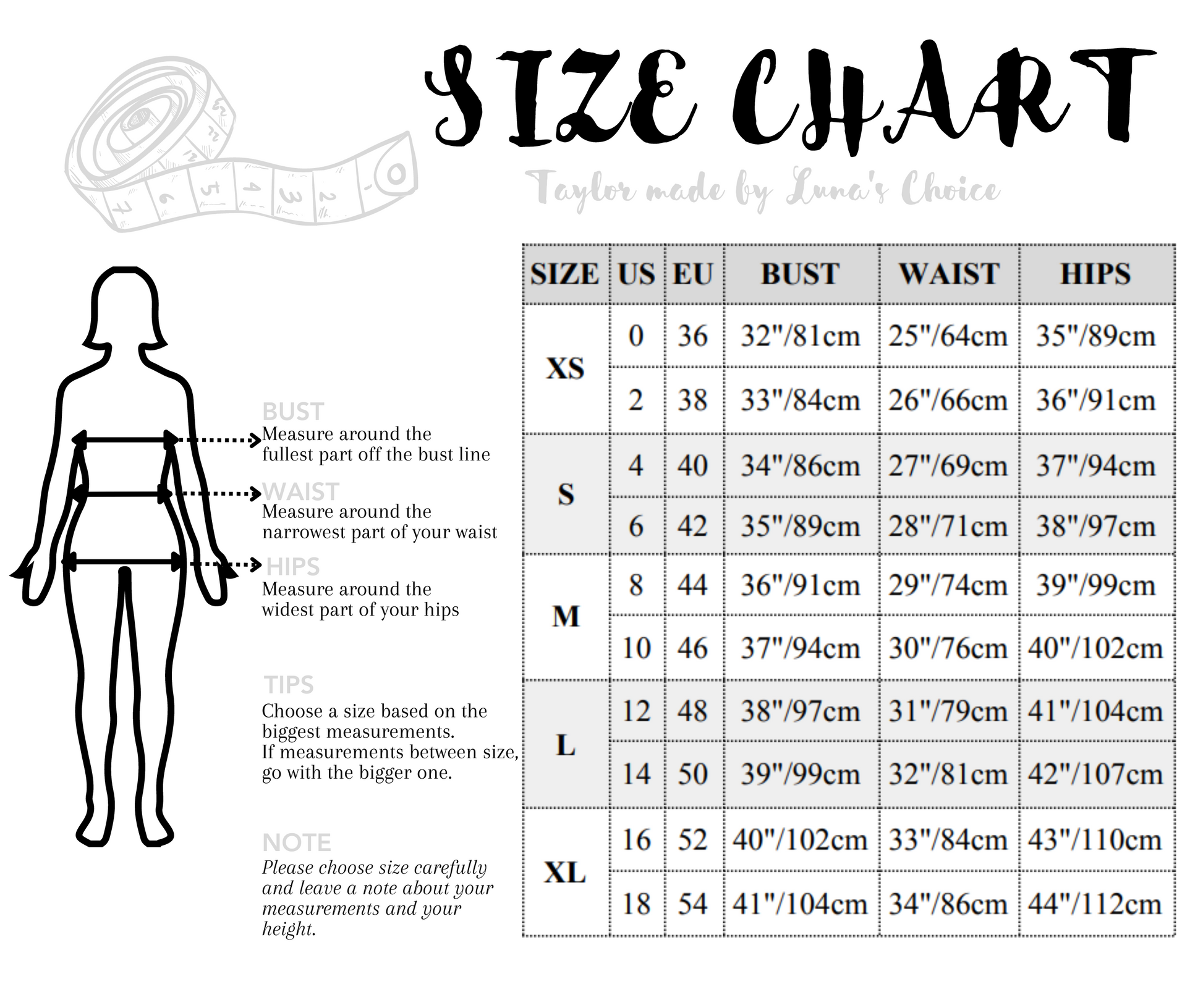- Each item is hand sewn to your measurements, please leave your measurements and your height in the notes section so that we can sew it to fit your size.